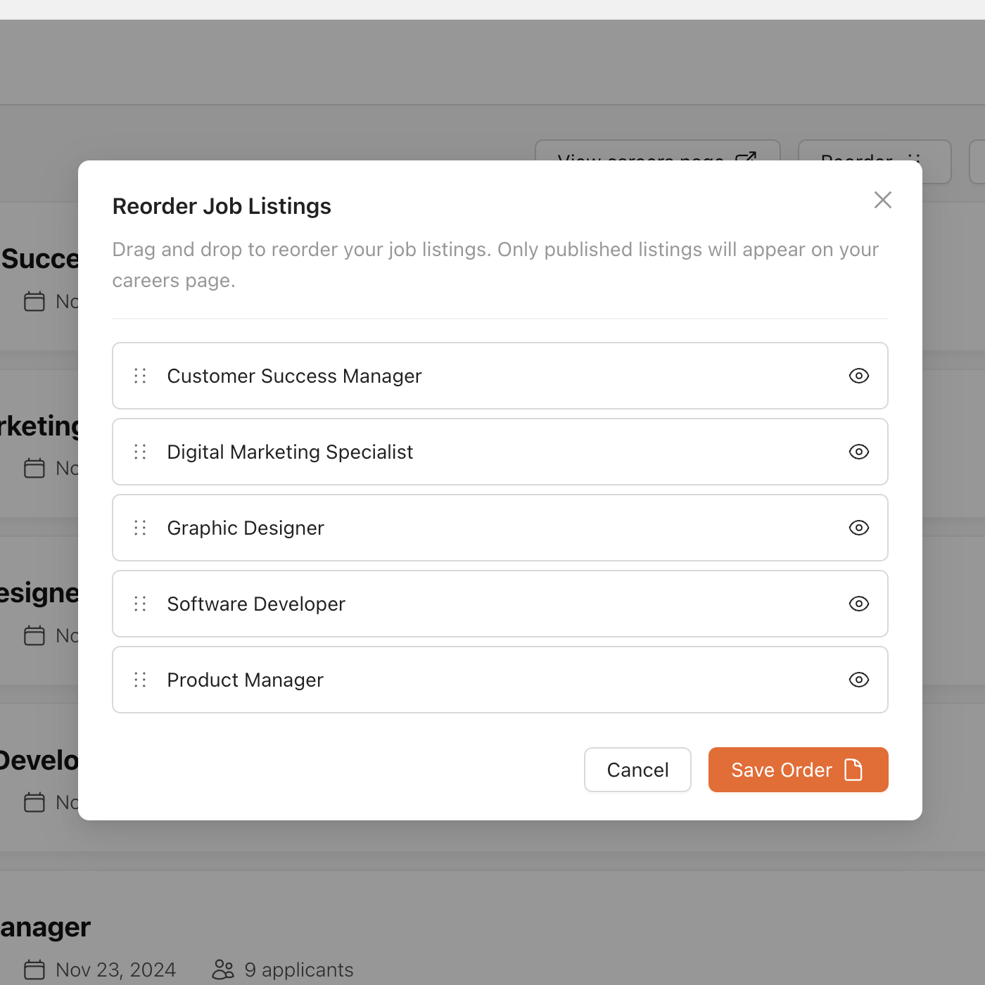 Control the order in which job listings appear on your careers page. By default, listings will appear in the order they are created. But now you can customize this with your own sort order by clicking the “Reorder” button on the listings page.