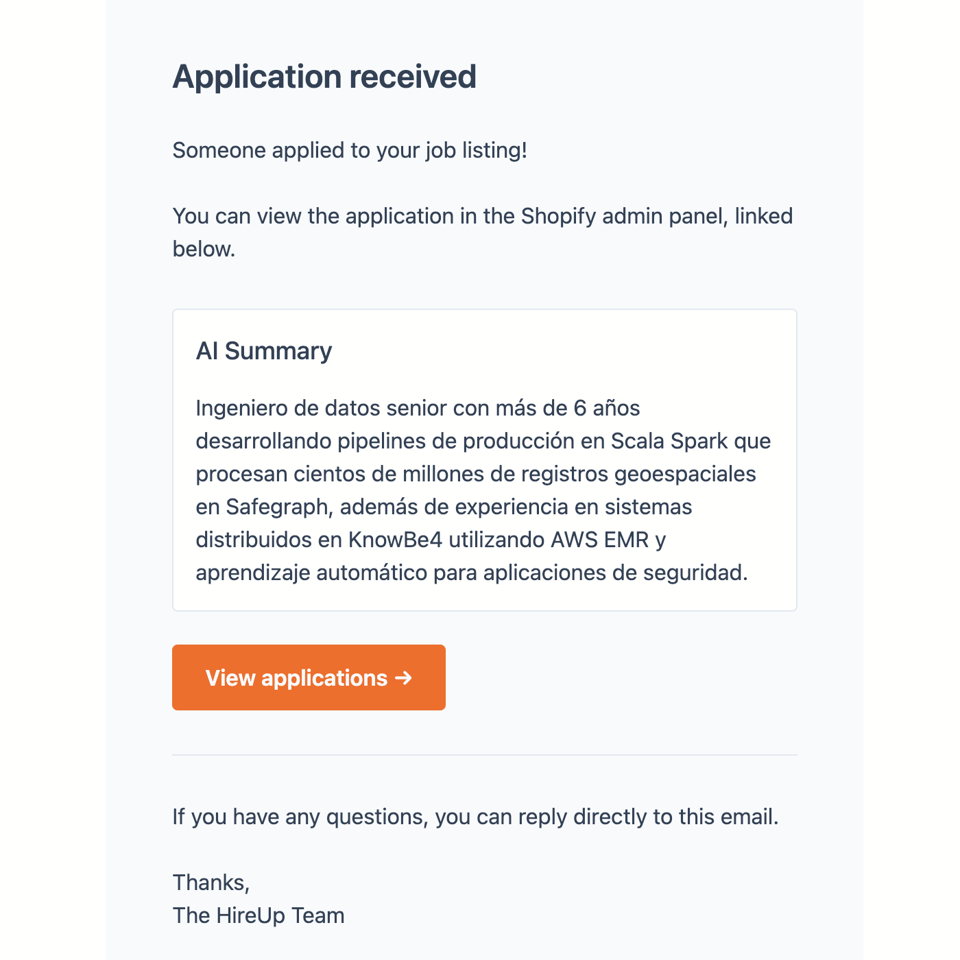 You will now receive AI summaries for applicants in the language that you have set for your Shopify store. If you are still receiving summaries in English and would like to switch languages, just let me know.